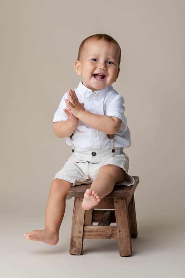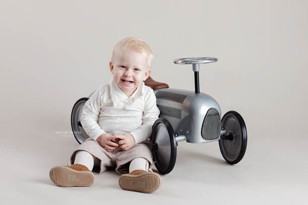 Ved et år klarer mange å stå oppreist og holde seg fast til ting. En gåbil i studio er mye brukt ved ett år og det finnes en del krakker og kasser som brukes. Det kan være lurt å få unna etårsfotograferingen før barnet begynner i barnehagen selv om ikke barnet er helt et år enda fordi når barna holder på med tilvenning så er de litt ekstra varsomme mot nye mennesker. Her kan dere velge mellom ute- og innebilder eller begge der.